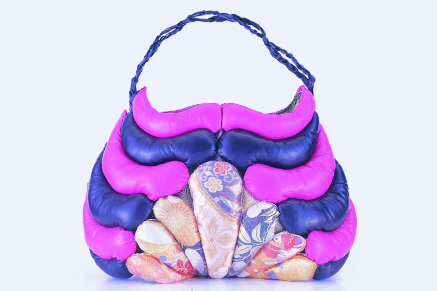 伝統的工芸品産業振興協会 産地プロデューサーの仕事。 豊岡カバンの復興事業の企画作品。 海外ブランドバッグに負けない、職人の頑丈な手仕事に加え、京刺繍の職人による"海老"をアクセントにした。 皮の割れ目から赤い布地がチラリと見えるようになっていたり内部の布地も表のオリジナルデザインの布地になっていたりと趣向が面白い。