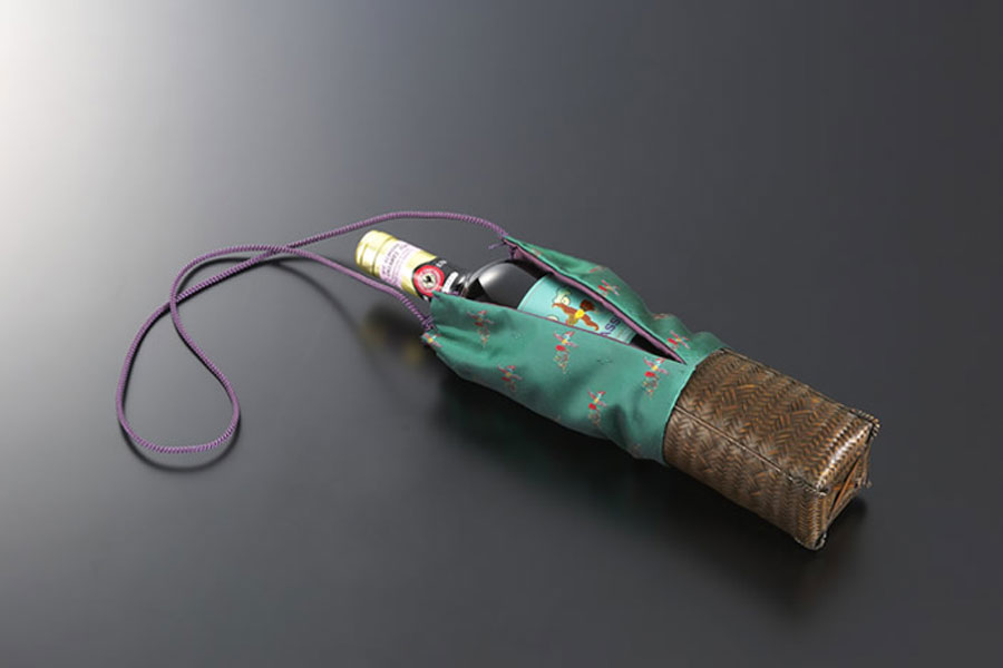うるしを全体に施した牛革を使用し、牛革に一層のステイタスと強度を加えた。 内部はポケット3つ。 一見よりも内容量はあり重宝。 正面と側面に、工芸品の組ひもを施し、 全体のカゴメ文様のうるし塗りで、和のイメージを強くした。