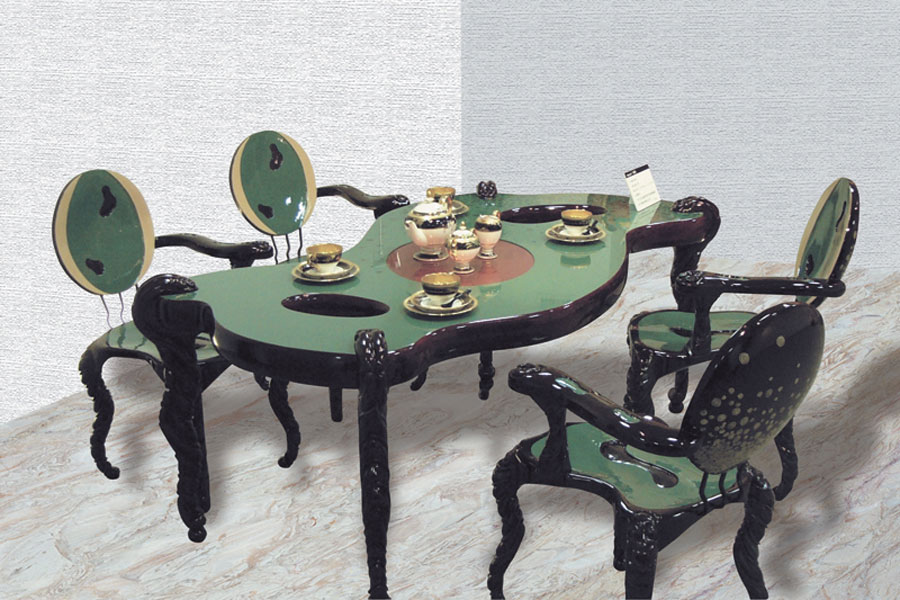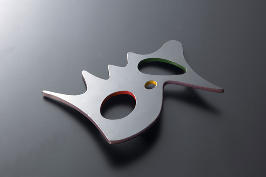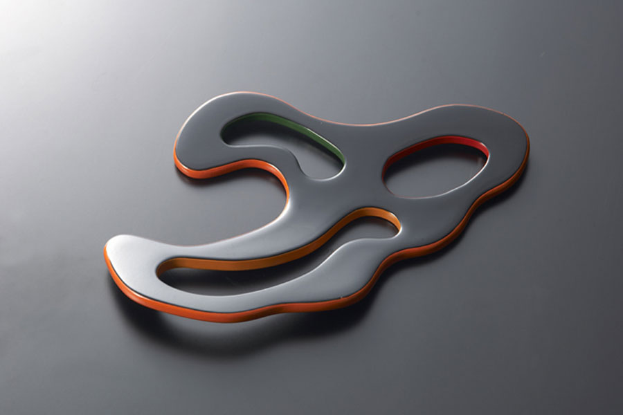 表デザインの得意とする"形になる前の形"をイメージしたフォルム。 越前うるし塗り仕上げ。 赤色面は、赤の深い発色にこだわった。 青色面は、日本の古色の"明け色"と言い、夜明けの空を表し、 塗りの技法も"ナシ地の溜色"と言って、キラキラとラメように輝く。
